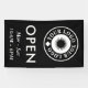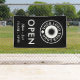 Open for business outdoors banner in black you can personalise with your business logo. Open beneath in big white letters. Open banner for outdoors use personalised with your small business logo and your opening hours.