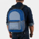 Blue grey backpack featuring a simple design with a few stripes. Add your custom quote.