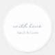 Chic With Love wedding sticker with lovely dusty blue font against a white background and light beige circular frame and couple names.