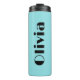 Simple minimalist and stylish turquoise and black thermal tumbler featuring your name in a fun retro text. Fully editable, including tumbler base colour, and text wording, colour, size, and style. Select "Personalise this template", and make your desired changes, or you can order this tumbler "as is". Shown is the name, Olivia, in black retro text on a fresh turquoise coloured tumbler with black lid. From 369MyName.