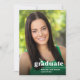 This simple, minimalist graduation card features a bold white typography overlay and a full photo. The word "Graduate" is written in lowercase letters in bold, trendy lettering, with the graduate's name and graduation year below. The white typography design is placed in the lower right corner and overlays a full photo with vertical orientation. The back of the graduation card includes a template to add graduation party details.