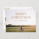 Modern minimalist Christmas postcard featuring a simple and minimal design with "Merry Christmas" in bold typography along with your family name in an elegant script over your favourite landscape photo. The template include a sheer gradient overlay to ensure the text is easy to read over your picture and may be removed in the design editing tool. The back has a second picture along with your personalised message.