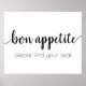 Simple monochrome black and white flourish horizontal "Bon Appetite Please Find Your Seat" shower, party, or reception table signage featuring a fun, casual hand-lettered script. The classic design includes a modern handlettered quote typography overlay. The lovely font with a customizable background color makes it easy to fit any theme. For other colors or matching products, please visit the JustFharryn Zazzle store, or contact the designer, c/o fharryn@yahoo.com All rights reserved. #zazzlemade
