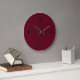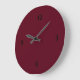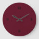 Modern clock features a minimalist design in a burgundy colour palette with black accents. A simple plain design with black numbers on a burgundy wine coloured background.