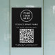 Simple modern black window cling sign for your business with a QR code for customers to scan for a list of your products, services, prices, hours, etc. Add your logo, business name, phone number and street address in white typography. Input your website URL address to generate a scannable QR code.