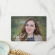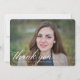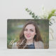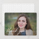 This simple graduation announcement features “graduate” calligraphed on top of your full bleed photo. Underneath, personalise the graduate’s information, school and degree information. On the back, a sweet, coordinating polka dot pattern.