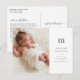 This chic grey and white birth announcement postcard features a simple, modern design. The front of the postcard includes a large square photo on the left and clean, minimalist text on the right. Customise with your baby's initial, first and middle name, birth date, birth details, and your names. On the back, you can write a personal message to recipients.