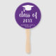 Minimalist graduation hand fans featuring a simple and classic design with a grad cap and "class of year" in a thick script handwriting along with the graduate's name in white over a purple background. The background colour may be changed to any colour you wish. A traditional style with a modern flair for a girl graduate.