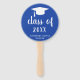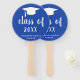Minimalist graduation hand fans featuring a simple and classic design with a grad cap and "class of year" in a thick script handwriting along with the graduate's name in white over a blue background. The background colour may be changed to any colour you wish. A traditional style with a modern flair for a girl graduate.