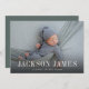 A simple and timeless birth announcement design featuring a full bleed horizontal or landscape orientated photo with baby's name and birth stats overlaid along the bottom in classic white lettering. Add three additional square photos to the back, along with a personal message.