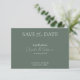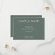 This modern minimalist sage green wedding save the date cards feature white script calligraphy text on a sage green themed background. A simple and classy design. Customise the save the date invitation with your wedding information and use the 'edit with design tool' on Zazzle to edit all text, fonts, background colours, text colours and option to upload and add your favourite couple photo to the back of the invite.