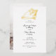 Simple Seashells in gold foil with calligraphy and classic fonts on simple front invitation. Reverses to watercolor sandy beach texture with earthy brown tones. This version has a conch shell at the top.