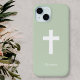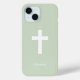 A simple and elegant light green phone case with a white cross and customisable text. A nice gift for a believer!