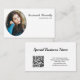 This business card design features a photo placeholder with template name and occupation. The back includes coordinated design and colours with text fields for the business name, details and qr code. Replace the placeholder photo with your vertical format photograph on the front and your QR code on the back. Fill in the personalise fields or click customise to select a font style, size, and colour you like.The placeholder photo is courtesy pixabay.com.