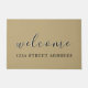 Welcome guests to your home with stylish elegance. This elegant doormat features a stylish welcome message and street address in black modern script on a tan background. Personalise with your custom message, address, family name or established date, or use the "contact this designer" button for help.