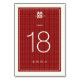 Minimalist chinese double happiness symbol and simple double happiness pattern in red / ivory within a classic frame, wedding table number card.