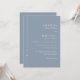 Simple, elegant and tasteful, this classic dusty blue wedding invitation design features a thin line border along the left edge with the bride and groom's monogram initial. A combination of timeless elegant serif font paired with a traditional script font is used for the bride and groom's names and other accent text. You can add, remove or adjust the placement of the text to suit your needs. The ever popular dusty blue background with white text adds to the clean simplicity of this design and is a lovely choice for weddings in any season of the year. The reverse side of the invitation has a text template for including a QR code to provide your wedding guests with an easy method of RSVP and to view details and plans surrounding the wedding. These invitations are available in both printed and paperless digital download formats.