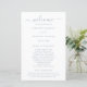 Simple wedding program with a clean and minimalist design featuring an elegant touch with the word "welcome" in script with swashes. A modern design with dusty blue text over a white background. These cheap wedding programs are printed on sheets of paper for a budget friendly option.