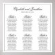 This understated yet beautiful 6 table seating chart will help your guests find their tables at your wedding reception. The simple black and white design features lacy script for the names of the couple as well as the table numbers, with a thin border around the edge. Elegant and sophisticated.