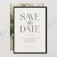 Simple Elegant Black White Script Photo Save the Date features a bold solid border, surrounding modern type that includes calligraphy script.