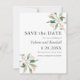 With elegance and simplicity, this nature inspired botanical wedding save the date card has sprigs of greenery and tiny peach coloured buds at opposite corners of the design. An elegant type face is used in the simple text template for personalising with your wedding information. The fresh colour scheme is a good choice for spring and summer weddings.