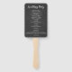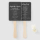 A simple, yet elegant wedding program fan that is sure to complement any event theme or wedding decor. Background is a dark grey chalkboard effect. What a great way to combine your wedding program with a practical wedding favour for hot, summer days.
