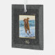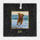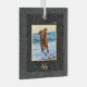 Simple Elegant Custom Pet Name Photo Black Botanical glass Christmas ornament with a gold monogram, white script name, and gold year.