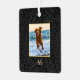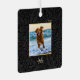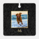 Simple Elegant Custom Pet Name Photo Black Botanical metal Christmas ornament with a gold monogram, white script name, and gold year. Merry Christmas in gold serit font on the back.