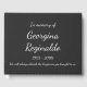 This simple and elegant funeral or memorial guestbook features a dark grey background, along with text in white script. It features a personalised name, birth/death years, and a customised message.