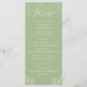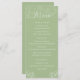 A beautiful and elegant sage green wedding menu card, featuring script lettering, white florals at the top of the card, and leaves at the bottom. Customise with your own meal options.