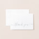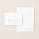 A simple, elegant design featuring the words "thank you" in handwriting script font across the lower front in real silver foil, featuring swash flourishes at the beginning and end that extend to the borders of the card. A versatile design you can use for any occasion when you want to thank someone special! Ideal for weddings. Also available in real gold foil.