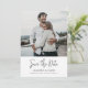 This simple, modern photo wedding save the date flat card has a crisp, fresh minimalist design. The default shape is sharp corners, but rounded corners also work wonderfully with this design, so try both looks in editing mode and see which grabs you! The front features a lively modern Save the Date text in black below your photo and your first names and date and wedding location below that. This 'save the date' script is black and can't be altered. But you can change the colour, size and font of any of the other text on either side. The default text colour for other text is also black, and on the back it's dark grey. In addition to editing the design to show your own details, you might choose to remove some text on back, and perhaps replace it with a different type of message of your choice. In any case, please do remember to remove all of our sample details, including the website info on the back side, etc.! The default setting on both sides is a transparent background, so the base colour will simply be the colour of your paper. You can easily change the background colour on one or both sides if you prefer a different look. Use the intuitive design tools and your inspiration to make this simple, modern custom wedding save the date flat card uniquely yours!