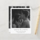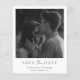 Modern budget wedding save the date featuring a simple minimalist design in classic black and white. Below your photo are your wedding details along with the word "and" in an elegant script typography. The back has a second picture along with additional details.