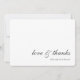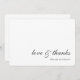 This simply elegant wedding thank you card features 'love and thanks' in an elegant script with your first names beneath it in a very dark grey tone that is mostly black on the front. We've made the 'love and thanks' entirely lower case, but you might choose to capitalise the 'L' and 'T'. And you might decide on a different format for your names, such as 'Mr. and Mrs....' or your first names and last name, etc. On the back, where we've added placeholder text in a different grey tone. You can change the text colour to black if you prefer, or any other colour that suits your style. The default shape is rounded corners, but standard sharp corners also work well with this design, so check out that look as well and see which you prefer. You might want to enter your own expression of thanks after deleting our placeholder text on the back, or you might prefer to delete our text and leave that blank so that you can later write your message by hand on each card. Similarly, if you do decide to enter your own message, you might choose to add your names as well, or enter just your message without your names so that you can sign your names by hand on each card after you receive them. You can also of course change the colour and font of the text. We set the background as transparent to let the colour of the paper simply serve as the base tone on both sides. But if you prefer another look, you can choose a colour for the base on either or both sides. Use the intuitive editing tools and your inspiration to make this chic wedding thank you card uniquely yours. And please check our store for a selection of other elegant designs!