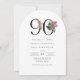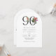 This 90th birthday invitation features a clean, sophisticated arch shaped design with a touch of elegance. The number "90" is prominently displayed in large, graceful serif font embellished with vibrant tropical flowers and lush foliage to add a burst of colour and painted details. Palm fronds, hibiscus, fig blossoms, anthuriums, bird of paradise, and orchids adorn the number "90" with beauty and elegance for this special milestone birthday celebration. Below the age, the event details are presented in a smaller, equally elegant serif font, ensuring the layout remains balanced and sophisticated. The overall layout is minimal yet chic, with generous spacing between elements to maintain clarity and elegance, creating an invitation that feels both personal and timeless. Personalise the easy-to-use text template with your event details. These invitations may be ordered in both printed and instant download digital formats.