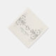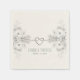 Simple elegant personalised wedding napkins with name and date, modern sage green calligraphy, silver rope heart and gilded floral lace.