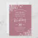 This beautiful wedding invitation features a simple yet elegant design with lacy script calligraphy on a dusty rose or mauve pink coloured background and frilly white floral lace filigree in the corners. The colours are perfect for a winter ceremony.