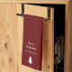 Merry Christmas Festive red kitchen towel, with a simple evergreen and customisable typography design. A great addition to your kitchen decor this holiday season.