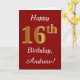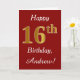 This simple birthday card design features the message "Happy 16th Birthday", with the "16th" having a faux gold-like appearance. It also features a customised name, and a dark red background. It could be given to somebody who is celebrating their sixteenth birthday.