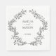 Simple Floral Frame Black and White Paper Wedding Napkins. Celebrate your special day with these elegant wedding paper napkins, beautifully adorned with a delicate floral wreath. The design features a sophisticated script for the couple's names, enclosed within a charming hand-drawn botanical foliage hand drawn style illustration. Below the names, your custom wedding date is elegantly displayed. These napkins add a touch of timeless romance and natural beauty to any wedding reception, perfectly complementing a garden, rustic, or classic wedding theme. Make your celebration unforgettable with these exquisite details. Perfect for the bar area or the dessert or appetizer table.