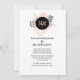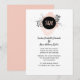 Minimalist wedding invitation, done in white with a splash of blush peach watercolor, at the top, with a simple black floral decoration. A black disc text area has the bride and groom's initials in peach. The back is done in a solid blush peach. Personalise the custom text for your special day.
