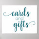 Luxurious turquoise aqua blue, aquamarine, seafoam, and white horizontal "Cards & Gifts" shower, party, or reception table signage featuring a fun, casual hand-lettered script. The classic design includes a modern handlettered quote typography overlay. The lovely font with a customizable background color makes it easy to fit any theme. For other colors or matching products, please visit the JustFharryn Zazzle store, or contact the designer, c/o fharryn@yahoo.com All rights reserved. #zazzlemade