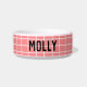 This dog bowl has a Modern, geometric, grid pattern complimented with a girly coral pink. Fully customisable and cute pet accessory. Ideal gift for the pet owner in your life, Personalised with names and your pet can have additional matching accessories such as collars and leashes.