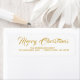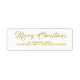 These custom personalised Christmas return address labels have gold coloured letters on a white background. It says Merry Christmas in script calligraphy or typography and has a sample name and address.