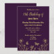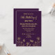 Unique simple birthday party invitation featuring romantic and elegant gold flowers and butterflies on purple background