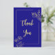 Unique simple wedding thank you card featuring romantic and elegant gold flowers on royal blue background