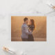 This simple photo save the date features casual script and a large photo. On the front of the card, "Save the date" is written in gold calligraphy. The couple's name is written in white above the script, and the wedding date and location are written below the script. The gold and white text overlays a full-bleed horizontal photo (landscape orientation). Additional wedding details (including the wedding website) can be added to the back of the card.