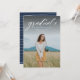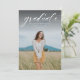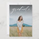 A simple classic script "graduate" in white accentuates a single vertical photo of your grad. This graduation announcement works for both college or high school graduates and is simple enough to let your photo shine. It's a timeless design and also features a striped backer with a customisable colour (default is a classic navy blue). The words are at the top of the photo but the design is also available with the words at the bottom.