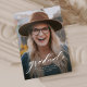 A simple classic script "graduate" in white accentuates a single vertical photo of your grad. This graduation announcement works for both college or high school graduates and is simple enough to let your photo shine. It's a timeless design and also features a striped backer with a customisable colour (default is navy).