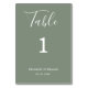Modern green sage background with  white script with the word "table" written in it appears on fashionable wedding table number cards. A taupe background or any colour of your choosing is used in the design. The pattern is repeated on the back. Include your name, wedding date, and table number when ordering the table cards. Individually add each number to your cart, then proceed to the checkout when done.